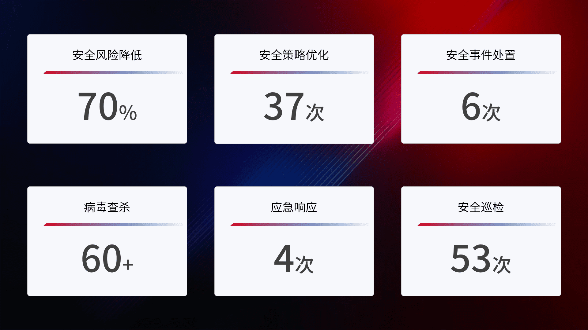 提供全面的安全事件报告体系,,,,包括处置报告、、周报、、季度和年度总结,,,结合持续监控,,,帮助客户深入了解网络安全状况。。。