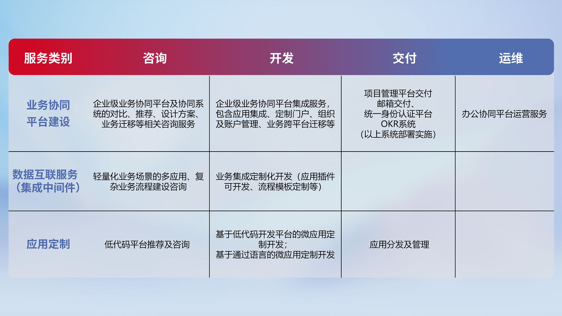 针对钉钉、、、、企微、、、、IDaas等平台级产品提供产品的规划、、方案、、、、交付、、、、定制化开发等服务,,实现如统一协同办公、、、、智能客户服务、、、混合会议管理、、、、智能数据查询、、、、等业务场景,,实现数字化转型。。。。