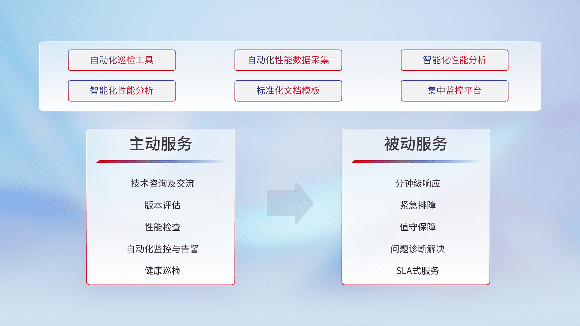 智能化工具和标准化文档,,,保障服务质量,,,,提供主动服务(包含技术咨询、、、版本评估、、性能检查、、、、自动化监控与告警、、健康巡检)和被动服务包含(分钟级响应、、、、紧急排障、、值守保障、、、、问题诊断解决、、、SLA服务)。。。。